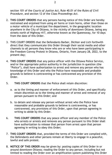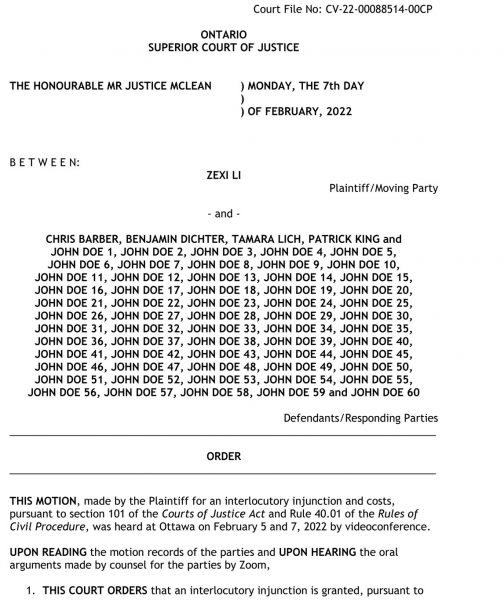 Ontario Superior Court Justice Mr. McLean wrote on Feb. 7: “THIS COURT ORDERS that, provided the terms of this Order are complied with, the Defendants and other persons remain at liberty to engage in a peaceful, lawful and safe protest.”